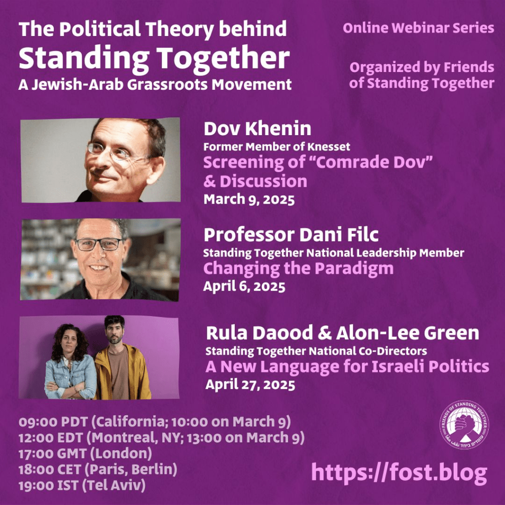Les Amis européens de Standing Together (FoST) ont organisé une série de webinaires destinée à tous les publics souhaitant explorer des approches alternatives pour promouvoir une politique inclusive et égalitaire en Israël, en mars-avril 2025.